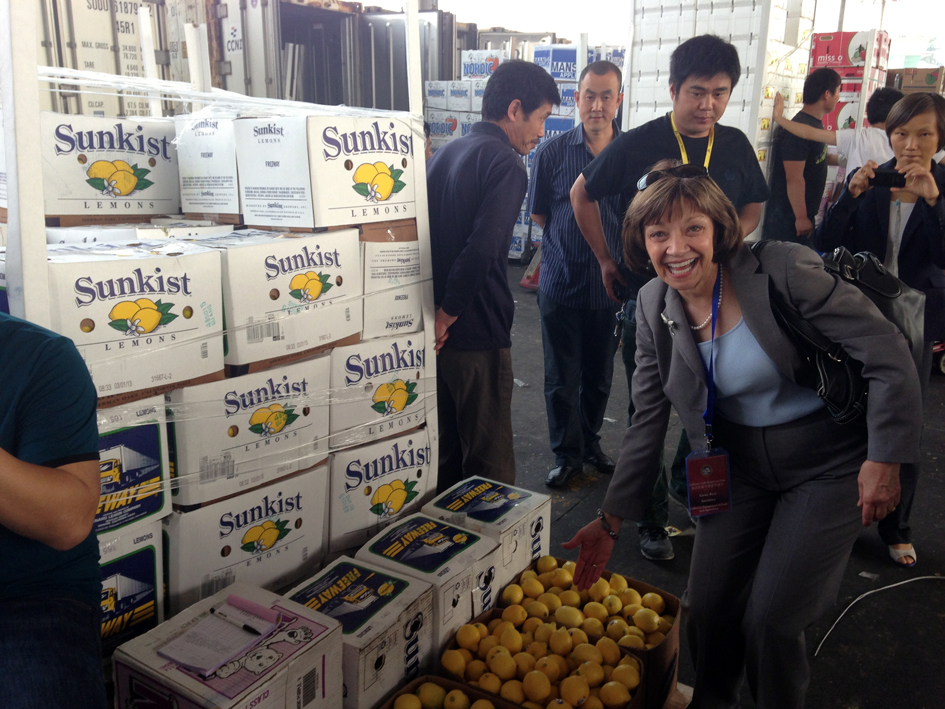 CDFA Secretary Karen Ross searches for California exports at the Jiangnan Fruit and Vegetable Wholesale Market in Guangzhou.