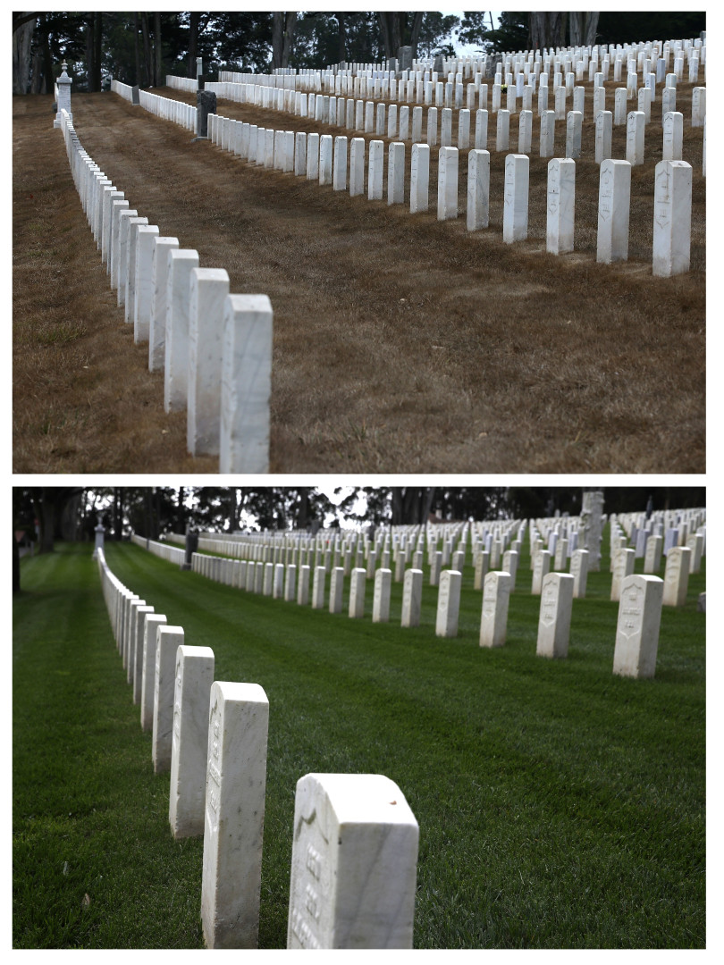 - JULY 15, 2014: (TOP PHOTO) Headstones are surrounded by dead grass at the Presidio National Cemetery on July 15, 2014 in San Francisco. (Photo by Justin Sullivan/Getty Images) APRIL 10, 2017: (BOTTOM PHOTO) Headstones are surrounded by green grass at the Presidio National Cemetery. (Photo by Justin Sullivan/Getty Images)