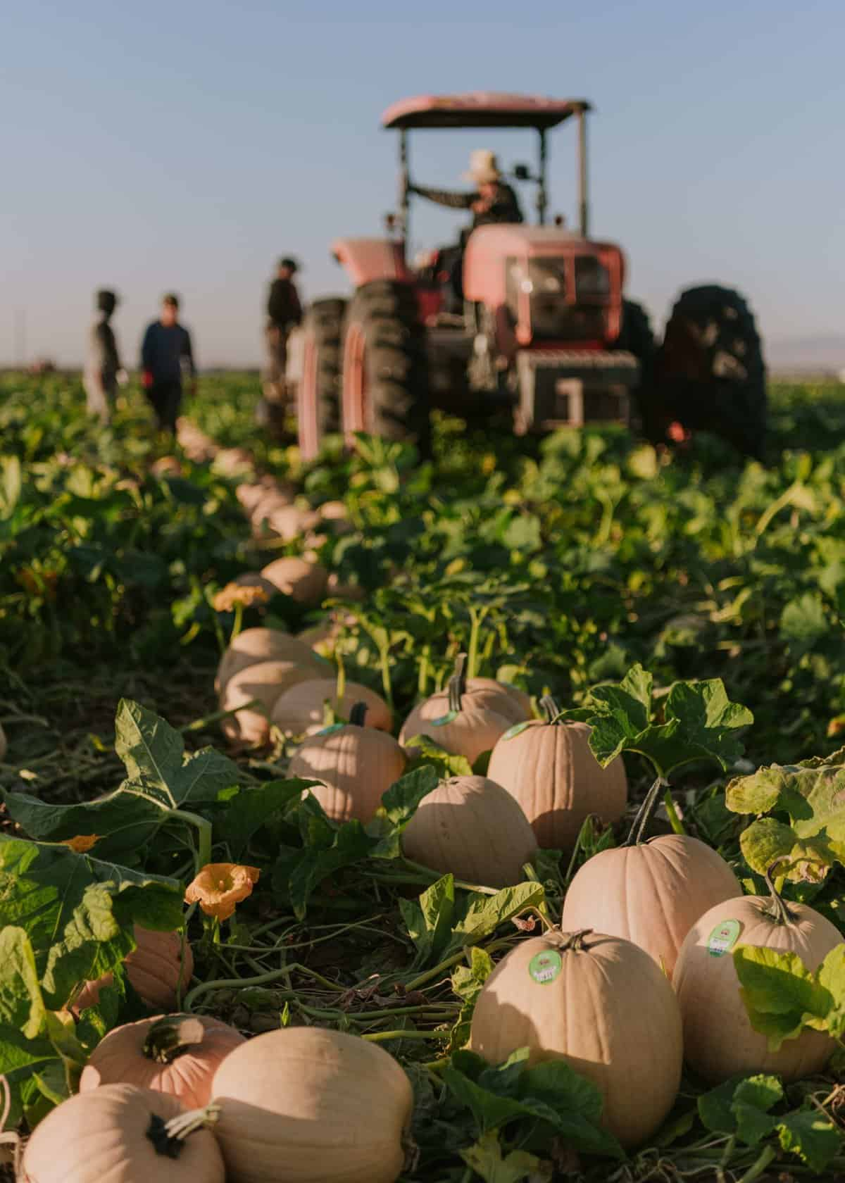 Pumpkin plants have a limited life cycle, so it’s important not to wait too long after they’ve ripened to harvest. “If you wait too long, that pumpkin plant will get weaker and weaker,” Hunter explains. “In the Central Valley, the heat can become an issue. We have to make sure the sun doesn’t burn our plants. The minute they start maturing, the plants themselves start to brown up. When they don’t have any more shade, the sun will burn them, and they become susceptible to insects. So once they’re ready to go we get them outta there.”
