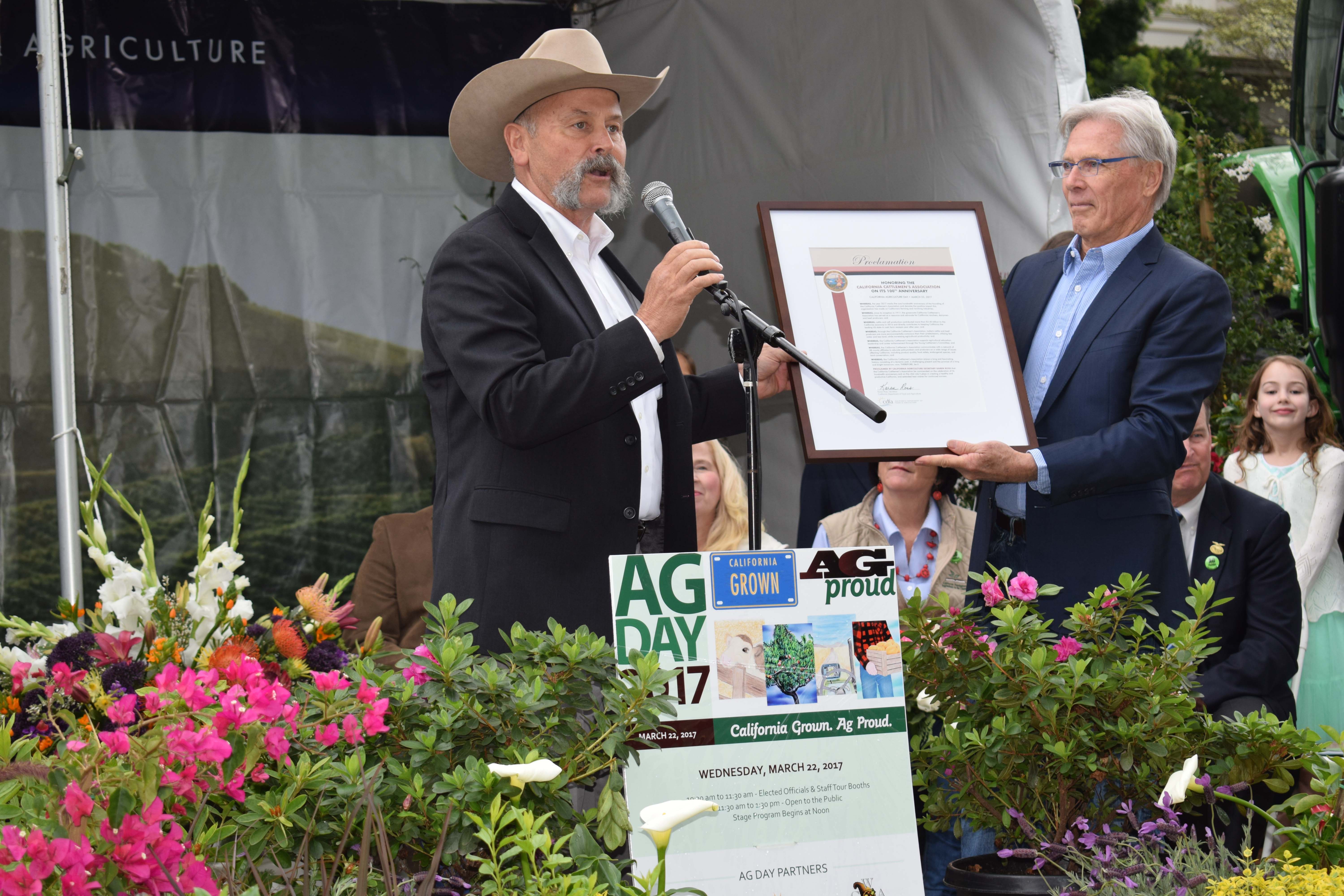 - California Cattlemen’s Association President Dave Daley, Ph.D., accepts a proclamation honoring the organization’s 100th anniversary from California State Board of Food and Agriculture President Craig McNamara. The proclamation was signed by CDFA Secretary Karen Ross.