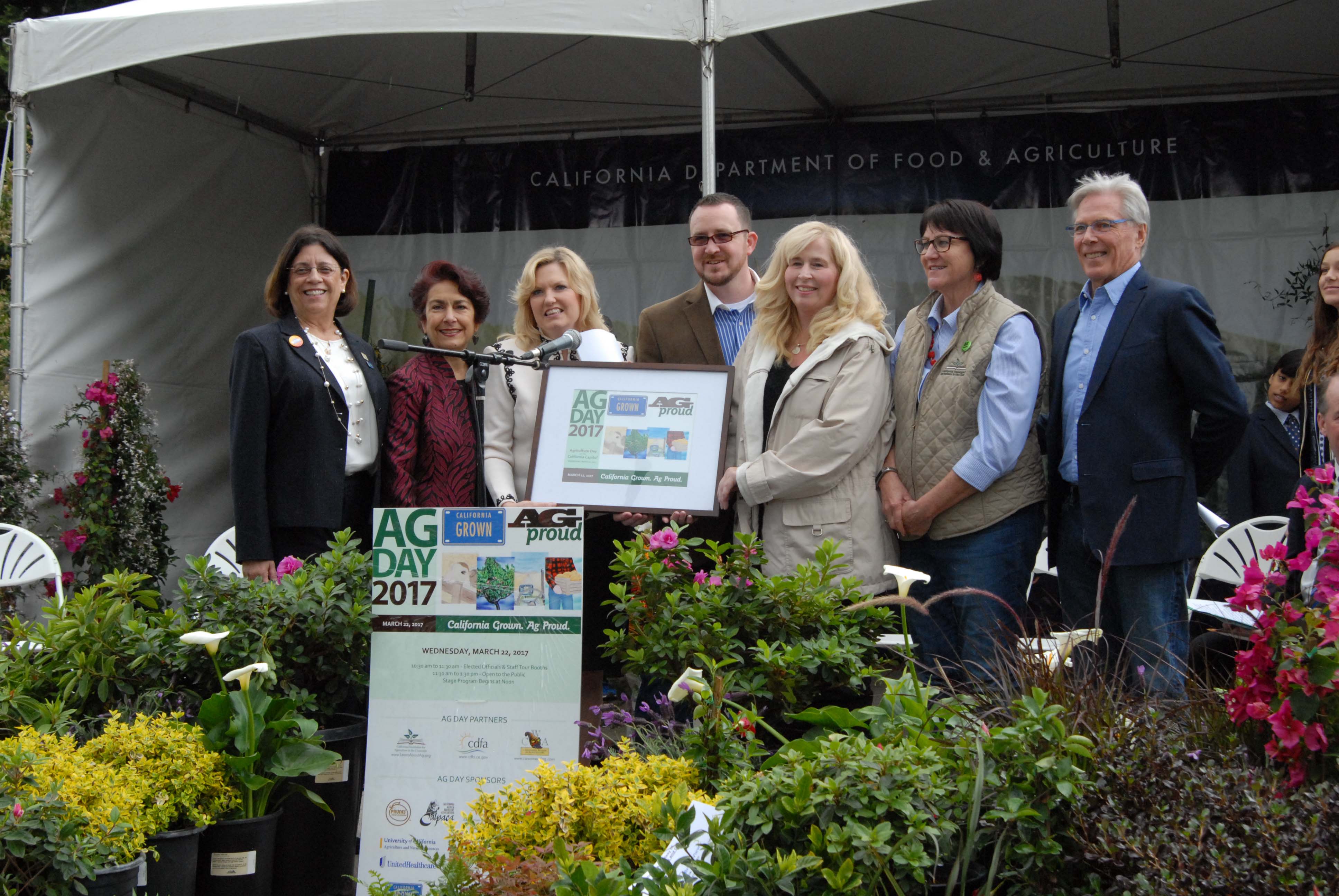 - California legislators braved the blustery weather and came out to enjoy Ag Day. From left: Assemblymember Cecilia Aguiar-Curry, Assembly Agriculture Committee Chair Anna Caballero, Senate Agriculture Committee Chair Cathleen Galgiani and Assemblymember Devon Mathis thanked Ag Day partners including California Women for Agriculture President Jeanette Lombardo, California Foundation for Agriculture in the Classroom Executive Director Judy Culbertson, and State Board of Food and Agriculture President Craig McNamara.