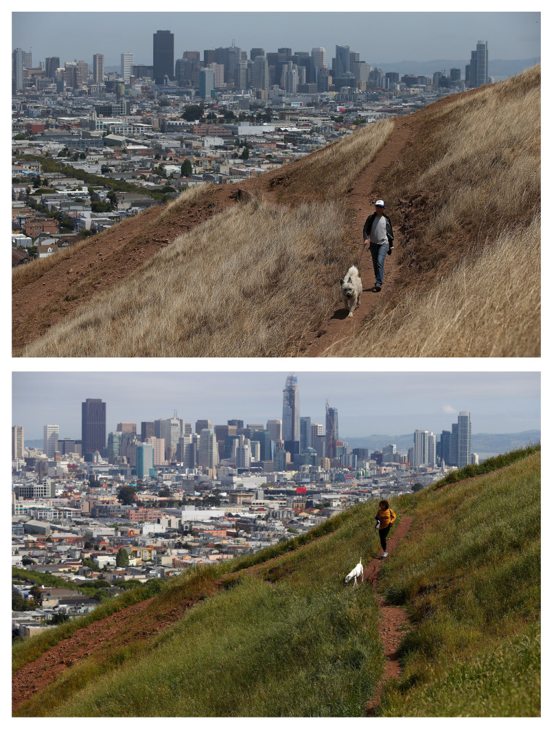 - JULY 16, 2014: (TOP PHOTO) A woman walks her dog walker on a dried section of Bernal Heights Park in San Francisco. (Photo by Justin Sullivan/Getty Images) APRIL 10, 2017: (BOTTOM PHOTO) A similar view at Bernal Heights Park. Photo by Justin Sullivan/Getty Images)