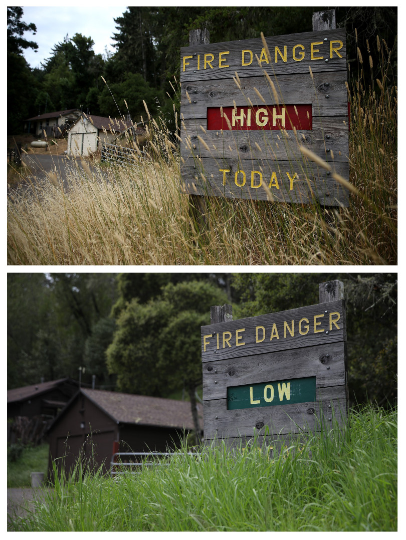 - JULY 15, 2014: (TOP PHOTO) Dry grasses partially cover a fire danger sign that is posted in Samuel P. Taylor state park on July 15, 2014 in Lagunitas, California. APRIL 10, 2017: (BOTTOM PHOTO) Grasses partially cover a fire danger sign in Samuel P. Taylor state park. (Photo by Justin Sullivan/Getty Images)