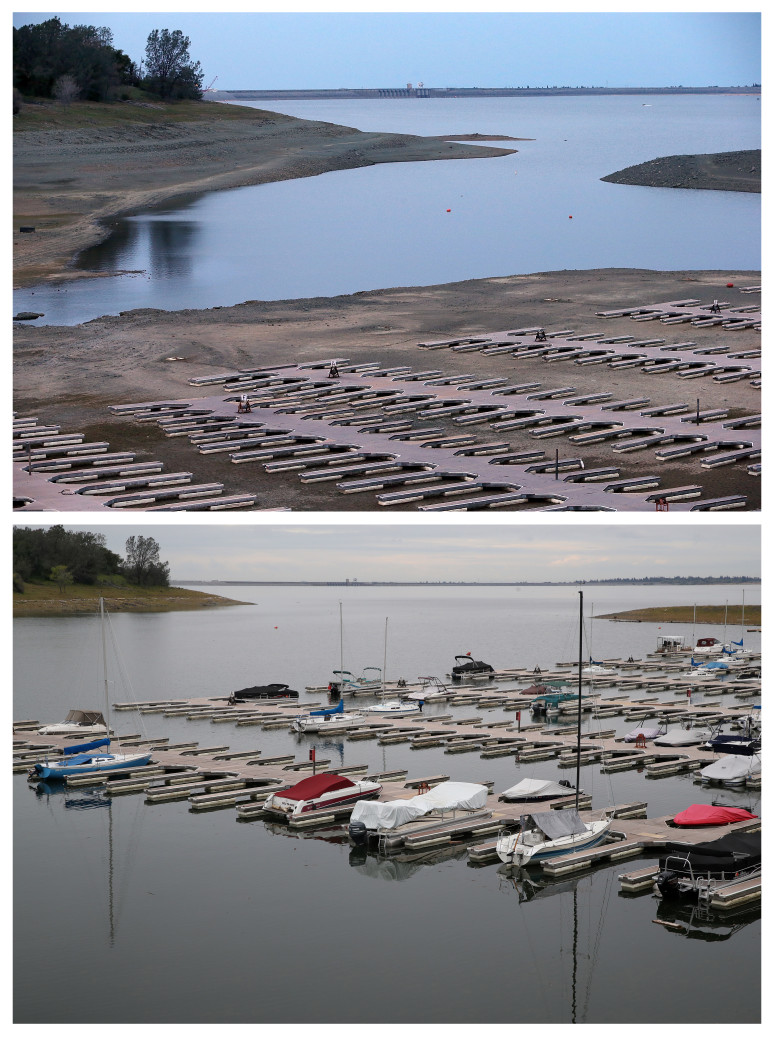 - March 2014: (TOP PHOTO) Empty boat docks at the Folsom Lake Marina sit on the dry lakebed of Folsom Lake. APRIL 11, 2017: (BOTTOM PHOTO) Boats sit docked at the Folsom Lake Marina. (Photo by Justin Sullivan/Getty Images)