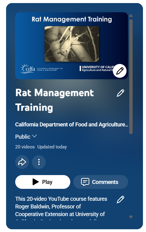 To view the Rat Management Training videos, visit CDFA’s YouTube page, where you can select topics to meet your agricultural needs.
