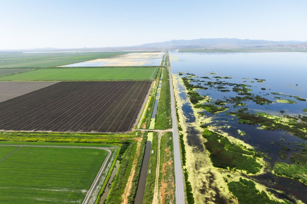 Water management in the Tule Lake basin is also unique. Because the land sits on an ancient lake bed, deficit irrigation can cause the soil to crack and damage nearby roads and structures. Instead, flood irrigation helps maintain soil stability. Scott explains, “The Klamath Reclamation Project is developed in a way that brings water from the top of the system down through it. Water is applied to a farmer’s field to the north of me. Then, through a series of drain ditches, they recollect the water, pumping it up for the next farmer to use. So, the land is actually part of our sponge and part of our water supply here. By flood irrigating and moving those crops around, we’re actually sustaining the floor of our valley.”
