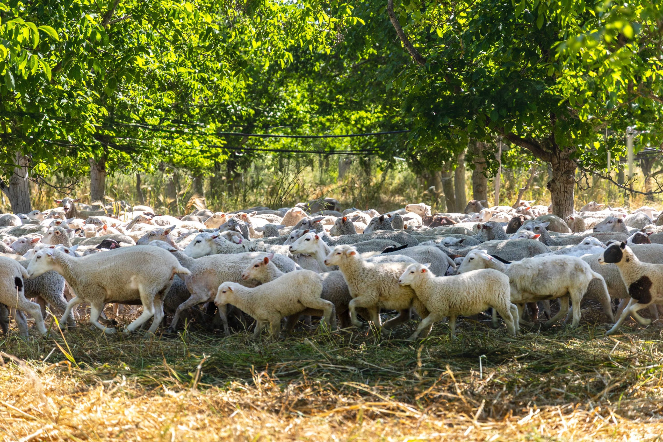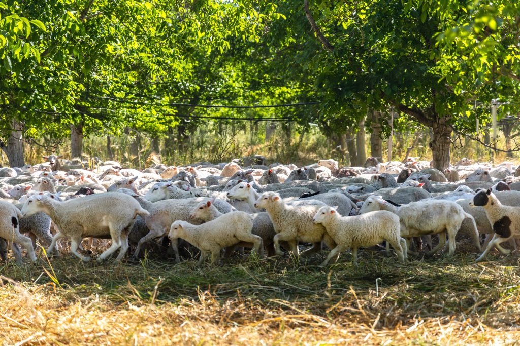 Cover crops are used extensively throughout the orchard to improve soil health and control weeds, pests, and diseases. Then, rather than tilling or mowing, hundreds of sheep are brought in to consume the cover crop. Sean McNamara, a second-generation farmer at Sierra Orchards explains, “The sheep incorporate the cover crop without the use of tillage. They package up those nutrients and organic matter into manure and urine, which is an amazing fertilizer. They help control insects and shoots and introduce more oxygen and sunlight to the inner orchard. Most importantly, the sheep reduce our tractor passes in half. So, whereas we would start mowing in March, we don’t have to start mowing until sometime in late June.”